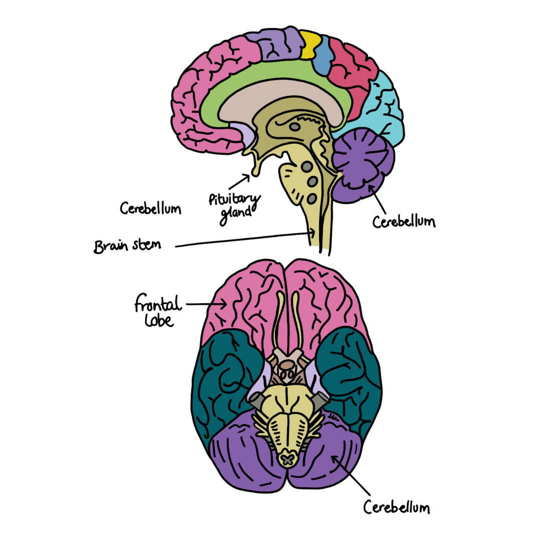 Cerebellum - This region is a fist-sized part of the brain which is found at the base of the skull. It’s role is to coordinate voluntary muscle movements and to maintain balance and posture.