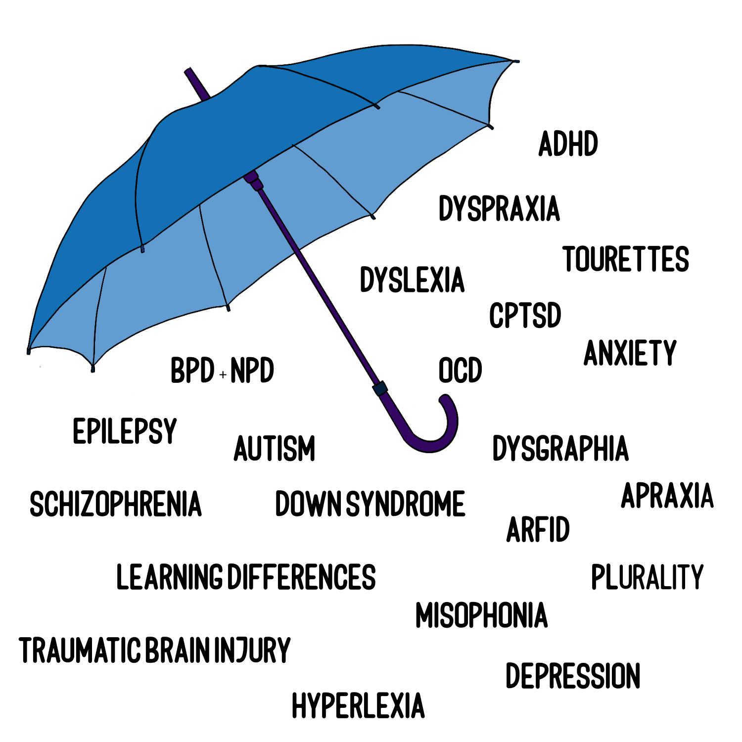 Neurodivergence is known as an 'umbrella term', which simply means it is a catch all for SO many different experiences. Your neurodivergent experience might be something you've experienced since birth (genetic, for example blindness or Down's syndrome) or something that has developed during your lifetime (acquired, for example brain differences after an accident).